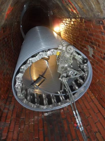 非開挖PVC螺旋纏繞襯里工藝(PVCspiralwoundlining)是由pvc等十幾種原料制成的內(nèi)襯修復(fù)材料。該技術(shù)的原理是將帶狀材料螺旋纏繞(通常是螺旋纏繞)pvc)安裝在需要修復(fù)的隧道內(nèi),并不斷前進(jìn)。材料膨脹后,舊管壁會(huì)緊貼形成新的管襯,每段修復(fù)材料之間會(huì)用特殊形式的鎖互鎖,接縫處會(huì)用鋼帶壓合。修復(fù)后隧道段面積損失較大,減少排水隧道流量;鋪設(shè)帶狀材料后,需要灌漿填補(bǔ)新襯里與舊管之間的間隙;