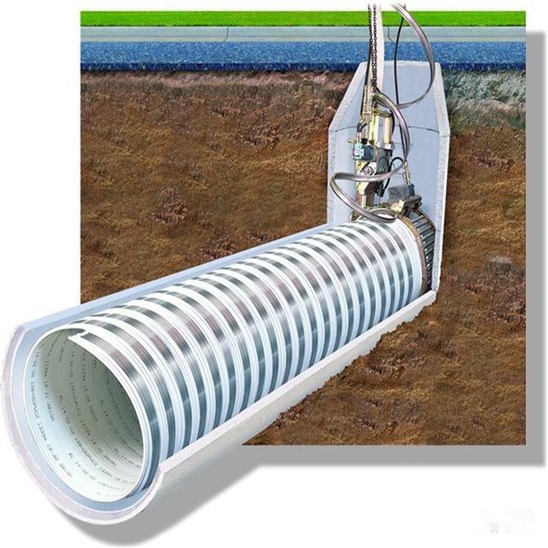 非開(kāi)挖PVC螺旋纏繞襯里工藝(PVC spiral wound lining)是由pvc等十幾種原材料制作而成的內(nèi)襯修復(fù)材料。適合修復(fù)污水管道及污水管廊,可修圓形、方形、橢圓形等異形,可量身定制模具,根據(jù)您的修復(fù)設(shè)備及尺寸定制開(kāi)發(fā)。